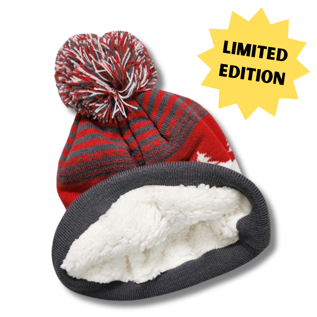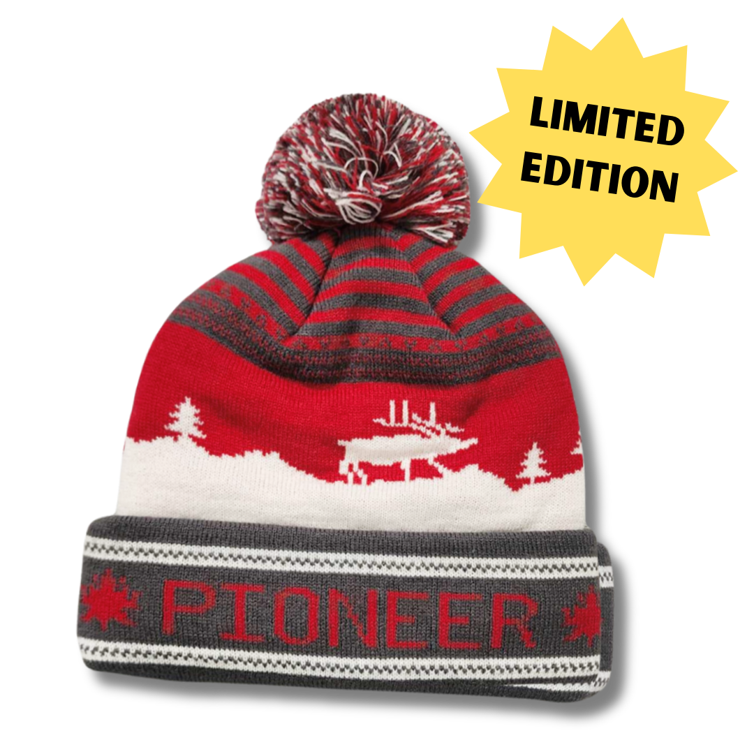 Designed with the thrill-seekers and the gold-sniping enthusiasts in mind, our fleece-lined knit hat is a cozy emblem of Pauly's passion. Each toque features a playful pom pom, a salute to the classic winter style, while the intricate design of maple leaves and majestic moose celebrate the heart of Canada and Pioneer Pauly.